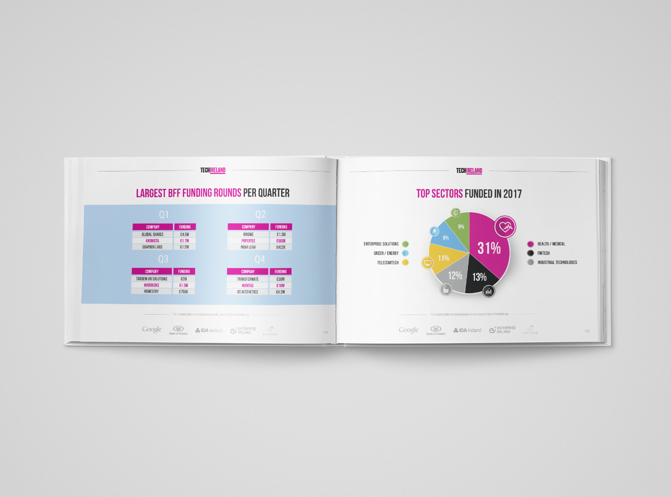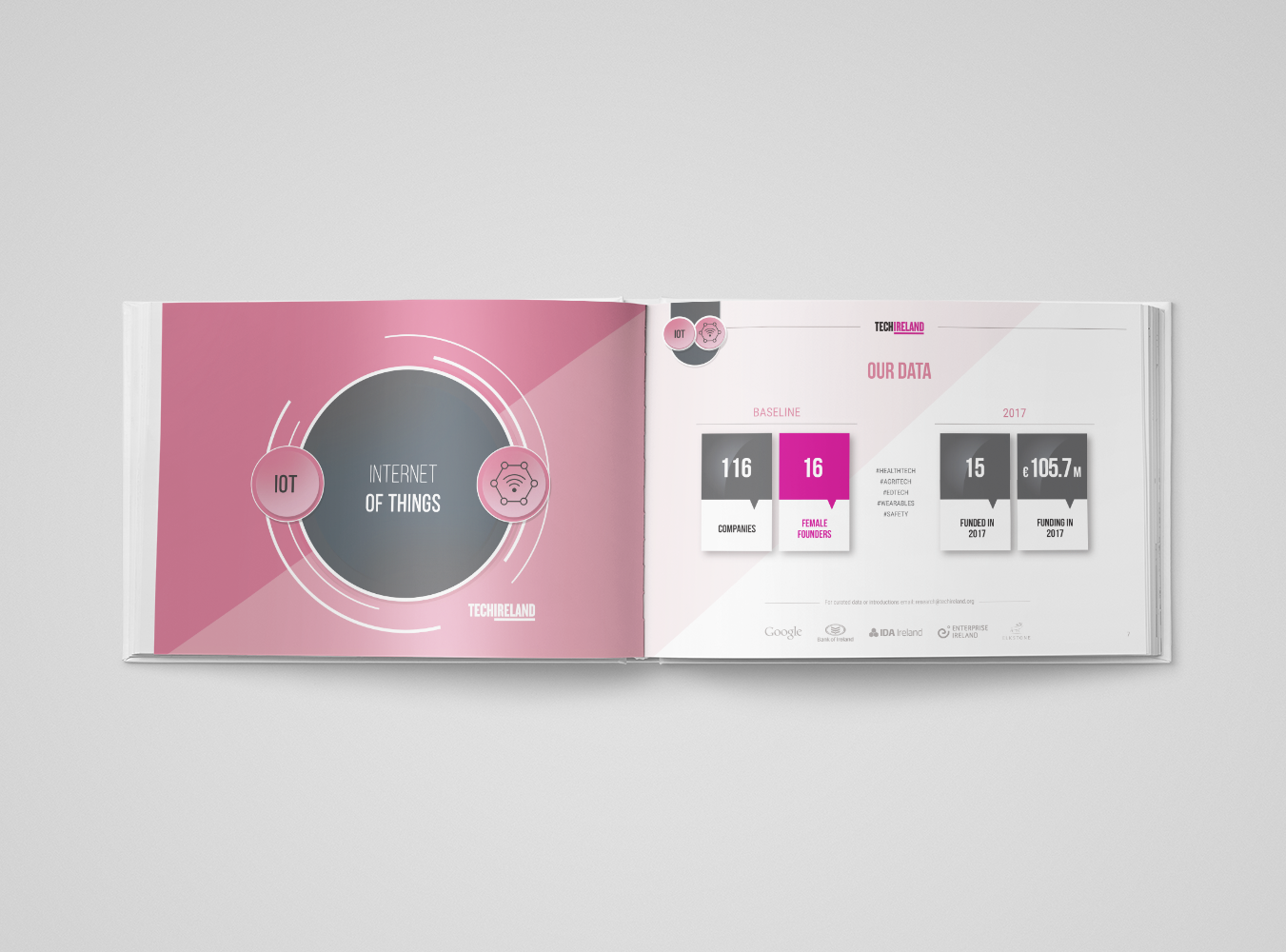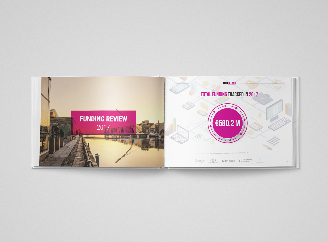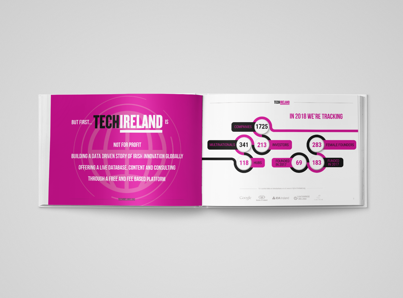 Graphic design and art-direction of a 143-page book for TechIreland, a key hub for Irish startups. The book,