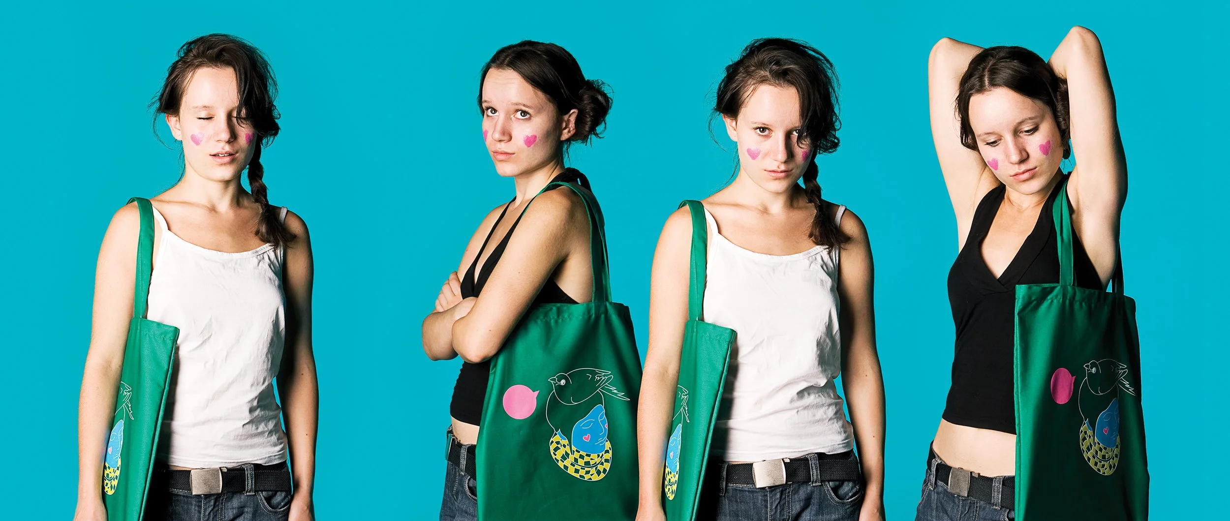 I photographed my friend Laura, who became the face of my “Sopolanko” tote bags. Each design played with different emotions such as philosophical, playful, bored, happy, and funny. I used it together with the background colours in the photos to reflect those moods and bring each bag’s character to life.